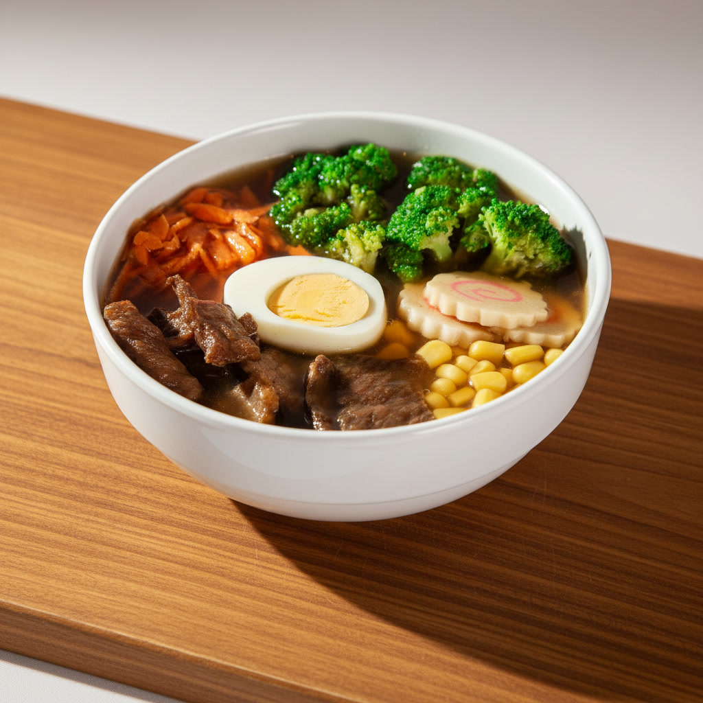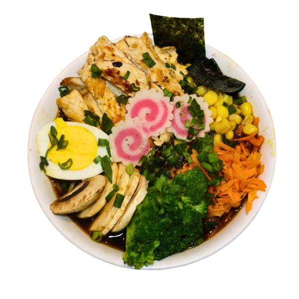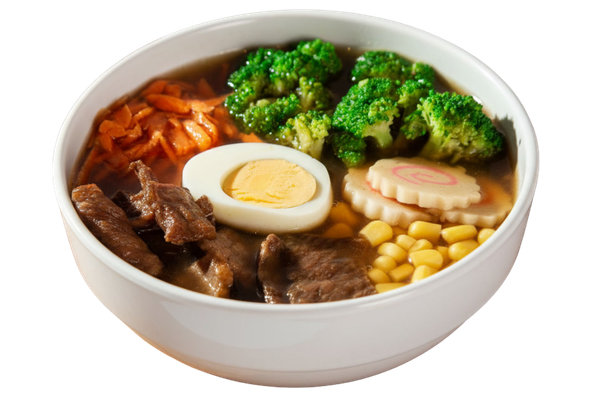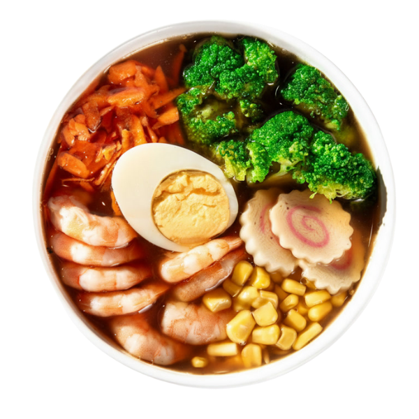 Pasta ramen, carne de puerco, champiñón, cebollín, zanahoria, granos de elote, brócoli y naruto.
