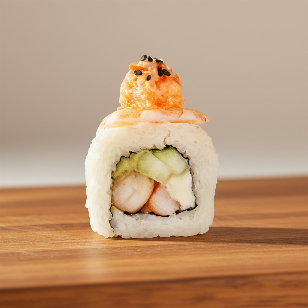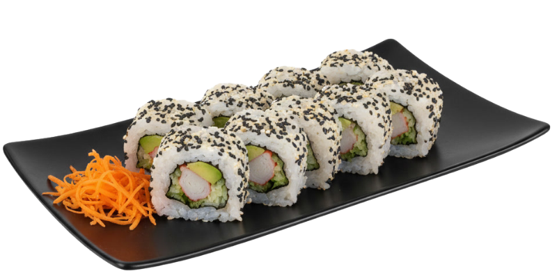 A: Alga, queso crema, aguacate y pepino F: Salmón, topping (queso crema, camarón y tampico), salsa anguila y ajonjolí