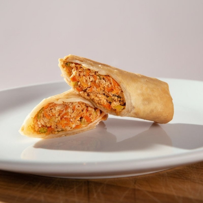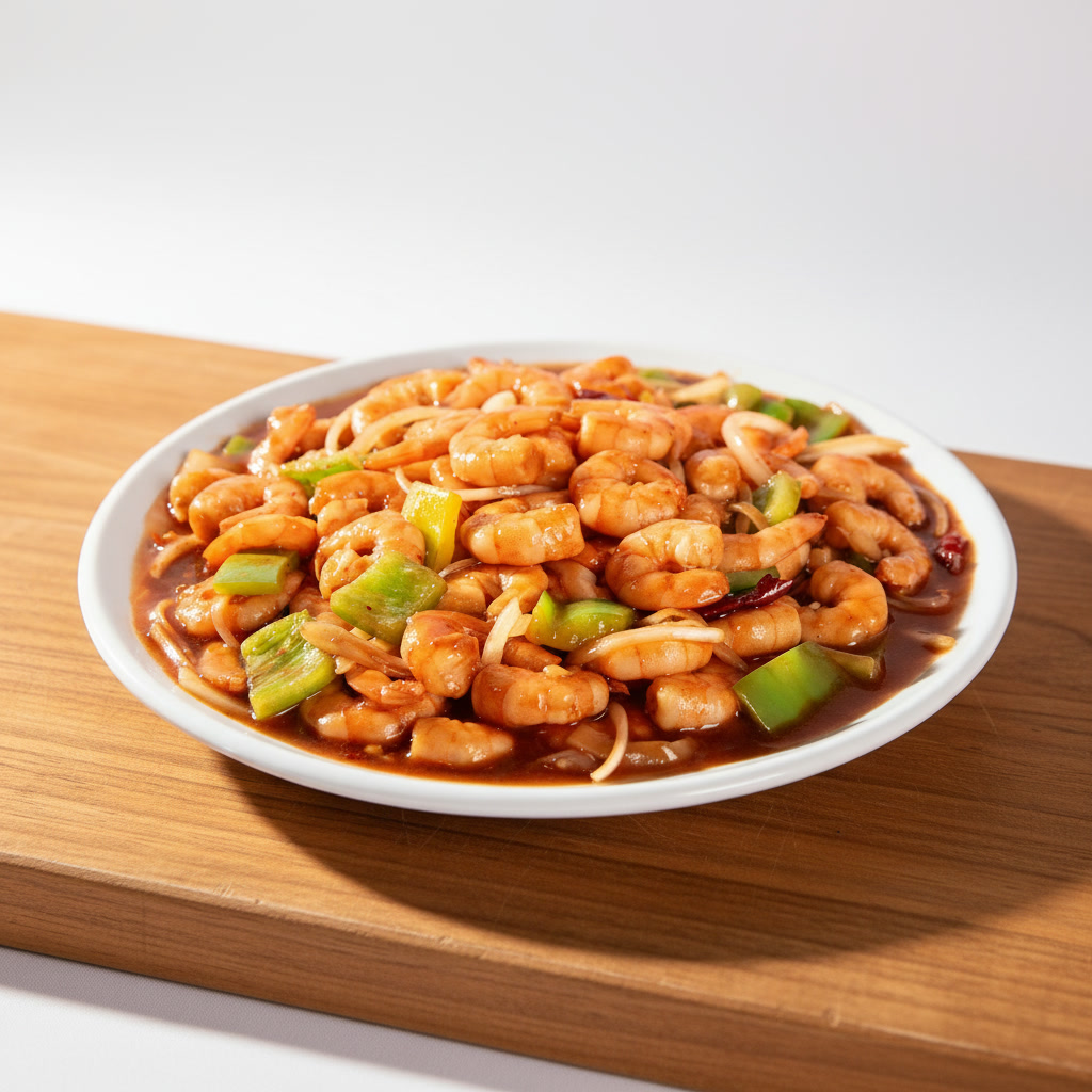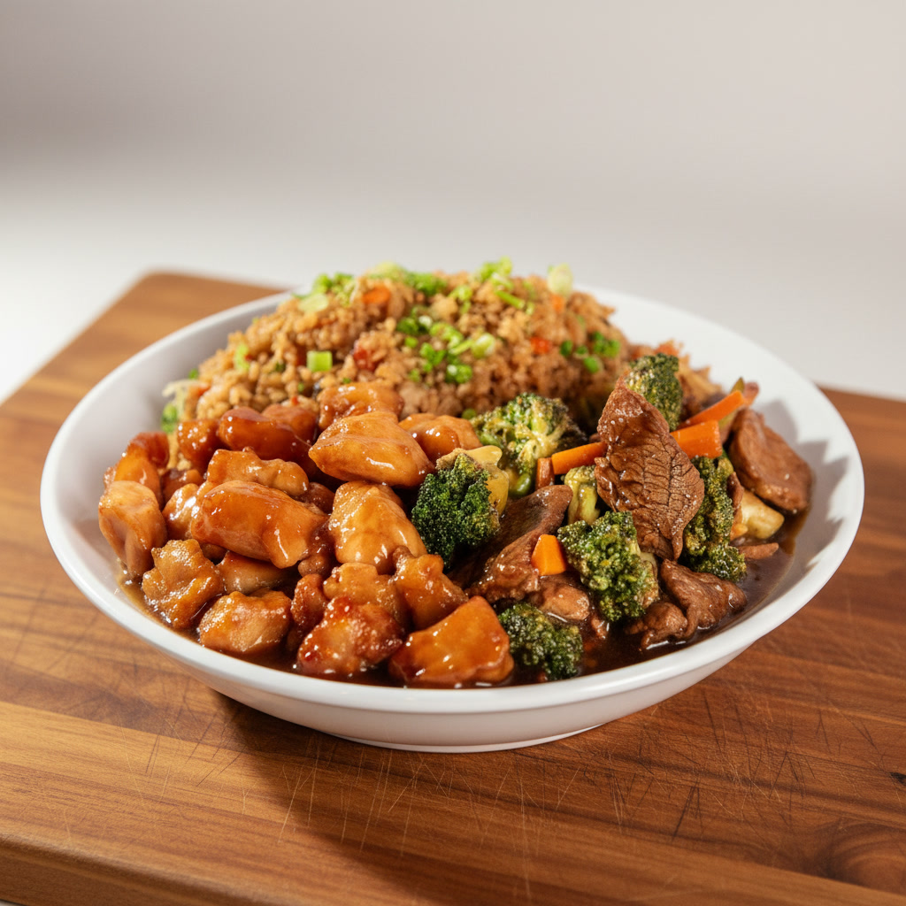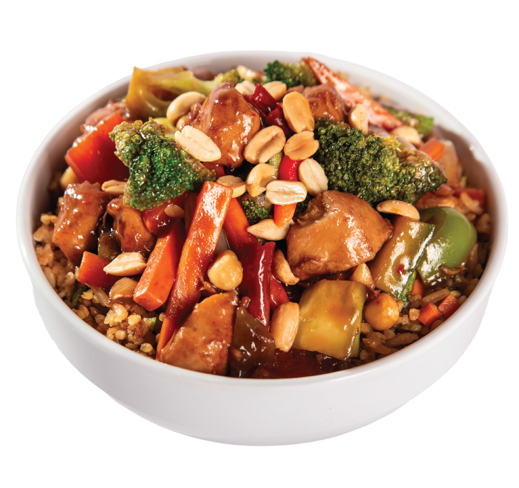Trozos de pechuga de pollo capeados y bañados en salsa mandarín, acompañado de pimiento morrón y zanahoria.